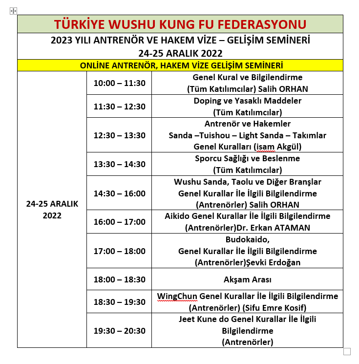 Not: 24-25 Aralık 2022 tarihinde yapılacak olan Wushu Kung Fu Federasyonu 2023 yılı Antrenör ve Hakem vizesini vaktinde yaptırmayanlar 1500 ₺ cezalı vize ücretini her biri için ayrı ayrı yatıracaklardır.